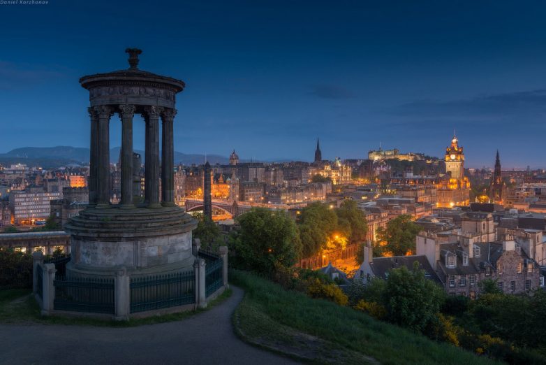 Город очень красив и с точки зрения фотографа: есть несколько чудесных видовых точек, с которых открывается панорама на город. Одна из них — Calton Hill, она на фотографии. Виден вдали замок Эдинбурга, и шпиль (остроконечный, справа от башни с часами) монумента Вальтеру Скотту. На монумент мы тоже забирались — и это того стоит!