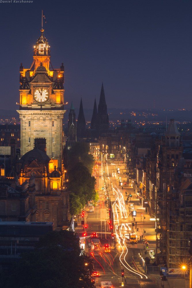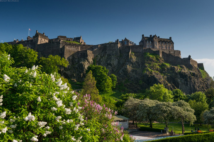 А на этой фотографии уже более компактно видны монумент и замок. Чудесное место для вечерних съёмок города! На заглавной фотографии — замок Эдинбурга днём. Это, наверное, крупнейший замок в Шотландии. Конечно, на его посещение стоит потратить практически полдня — с его стен открывается панорама на игрушечный город вдали, вплоть до моря: