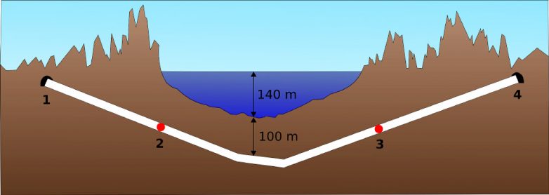 Это железнодорожный тоннель Сэйкан в Японии длиной 53,85 км. Тоннель опускается на глубину около 240 метров, на 100 метров ниже уровня морского дна Это самый глубоко залегающий под морским дном и второй по длине (после Готардского базисного тоннеля) железнодорожный тоннель в мире.