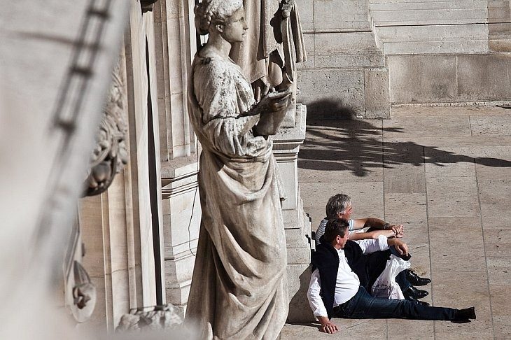 Ступени перед фасадом — одно из любимых мест отдыха горожан и туристов. Здесь всегда намусорено, но это совершенно не мешает прохожим греться на солнышке: