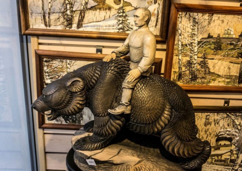 Вырезанная из дерева скульптура Владимира Путина верхом на медведе.