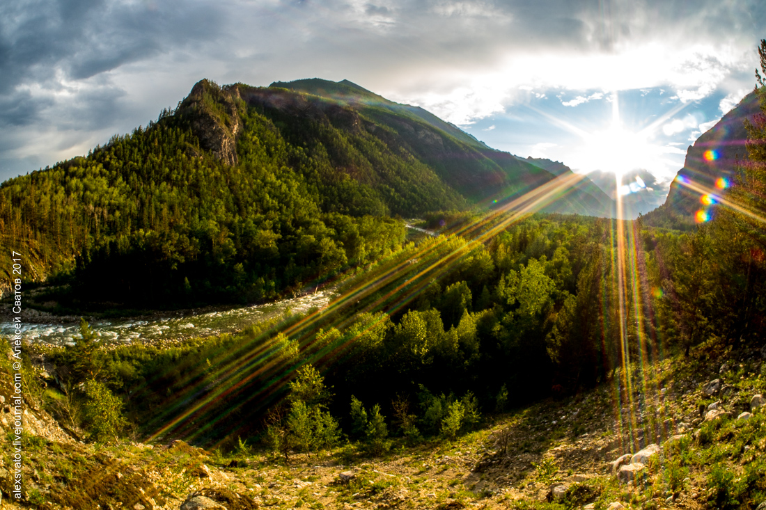 Вот такой интересной лампой встретил нас хребет при въезде в долину Алла. Косые лучи солнца вкупе с косым дождём рисовали картину в небе.
