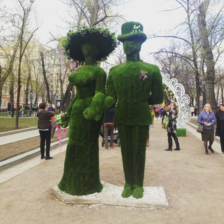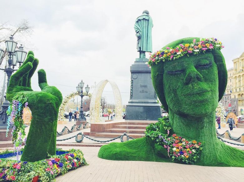 А Москве вполне сойдёт суррогат, за которым не нужно ухаживать и можно легко воткнуть в любое место. Например, выгулять на Тверской трёхметровых Пушкина с Гончаровой, которые в сравнении с нашей «зелёной бабой» смотрятся даже изящно.