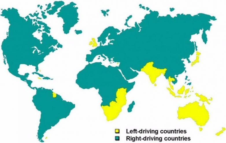 Желтым выделены страны мира с левосторонним движением
