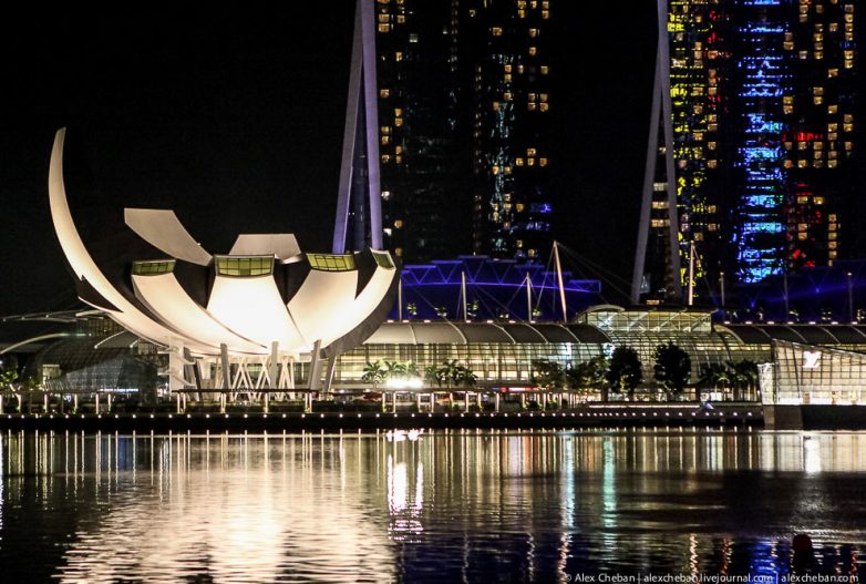 Научно-технический музей Art Science Museum. Увидеть форму здания можно с двух сторон: кто-то видит его в форме цветка лотоса, а кто-то в форме распахнутой ладони, десяти пальцев руки. Лепестки-пальцы спроектированы так, что могут собирать дождевую воду, которая спуститься в небольшой бассейн, расположенный внутри здания. Собранную таким образом воду впоследствии используют в технических целях. В самих лепестках расположены галереи: