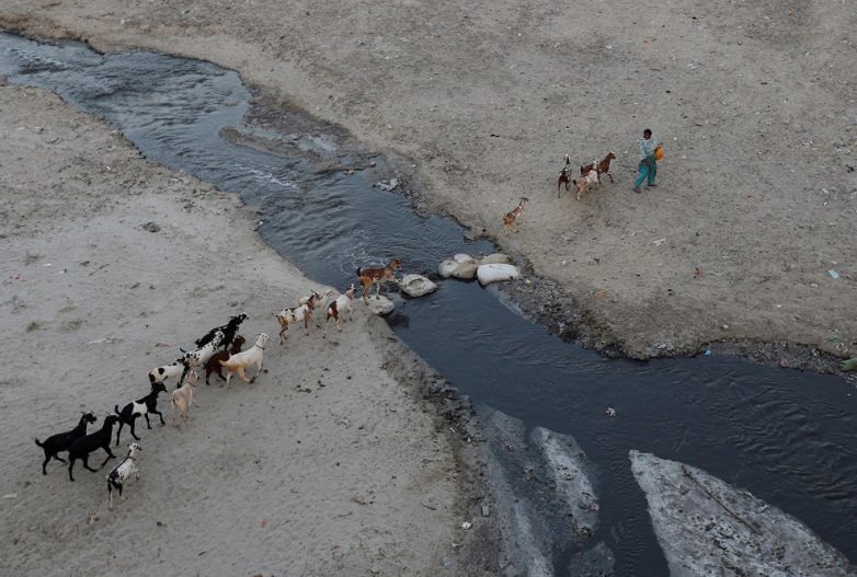 Очередной промышленный грязный слив, текущий в Ганг. Козам лучше через него перешагивать.