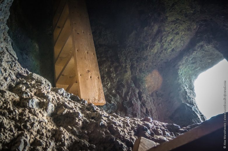 Стены и потолок закоптились от костров, а стены за сотни лет насквозь пропитались воском от свечей.