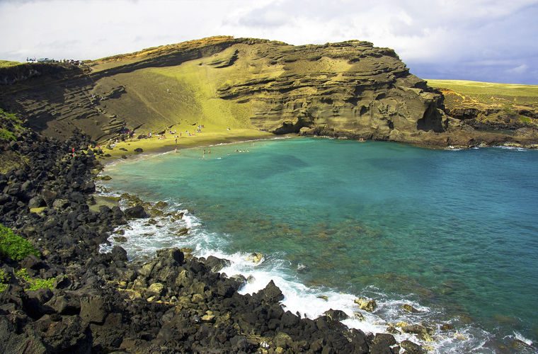Папаколеа (о. Большой Гавайский, Гавайи, США)«Гавайский бриллиант» — так аборигены называют пляж Папалокеа, расположенный на самой южной оконечности Большого Гавайского острова. В малой овальной бухте, огражденной скальным берегом, — прекрасные условия для отдыха: теплое море и широкое песчаное побережье. Только песок не совсем простой, в его основе — полудрагоценный минерал хризолит. Повышенная концентрация оливина (второе название минерала) создает песок оливкового цвета, который может изменяться до грязно-болотного оттенка.
