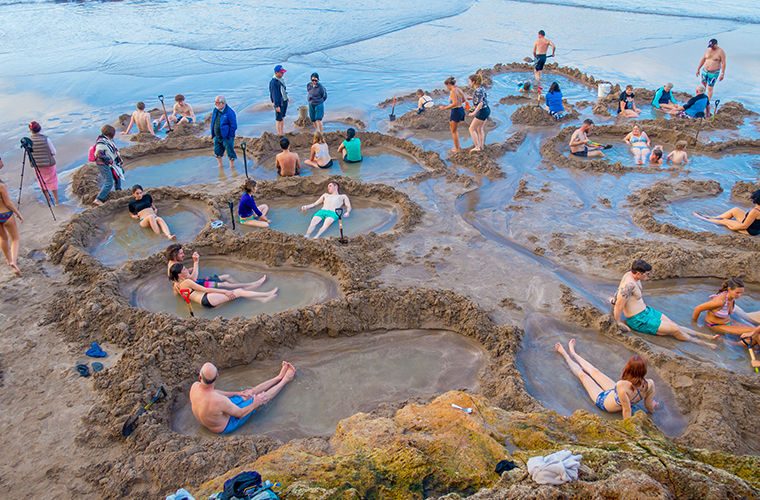 Пляж Хот-Уотер-Бич, п-ов Коромандель (Новая Зеландия)На Северном острове в Новой Зеландии находится пляж, который ежегодно посещает более 700 000 человек. Территория не отличается эстетичным внешним видом или особенностью воды. Достояние местности скрыто от глаз и становится доступно во время отлива: под землей здесь протекают термальные реки, несущие горячую воду в океан. При отступлении морской линии источники выходят на поверхность. Температура подземной воды достигает 64 °С. В расположенных рядом с пляжем магазинах налажен прокат лопат и ведер — туристы могут спокойно сделать себе импровизированную геотермальную ванну, вырыв небольшое углубление в песке.