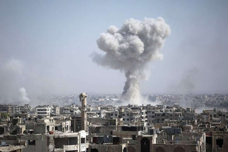 Авиаудар по подконтрольному повстанцам району Джобар в Дамаске, Сирия.