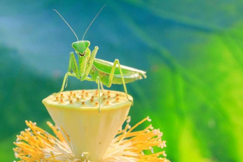 Богомол на цветке лотоса в Хуайане на востоке Китая.