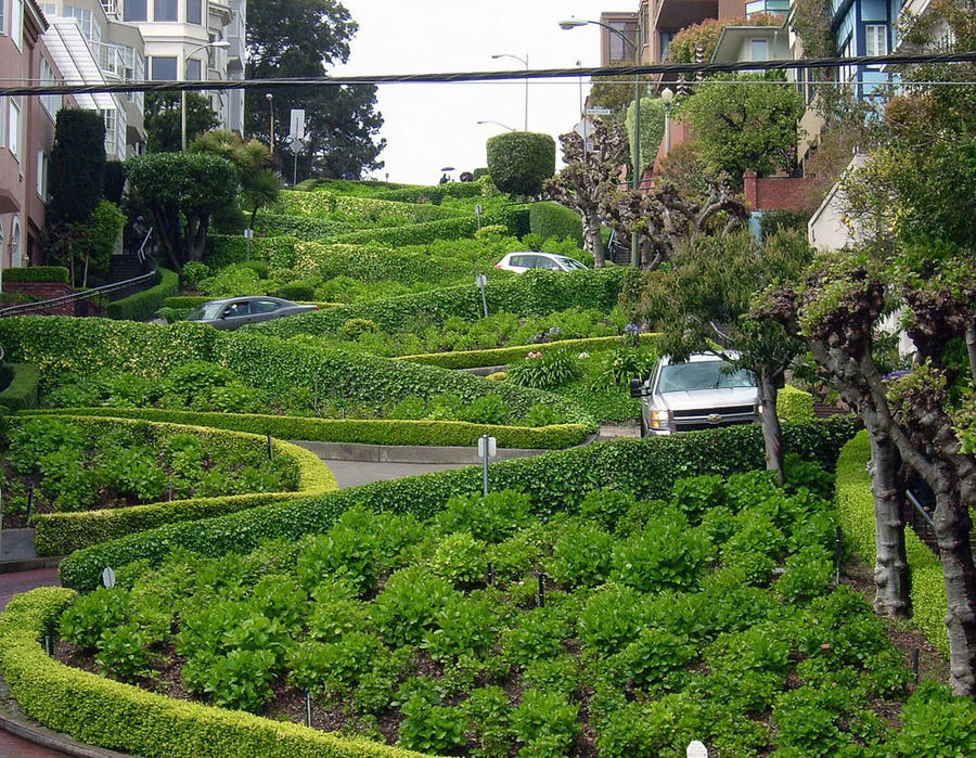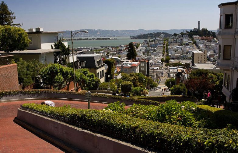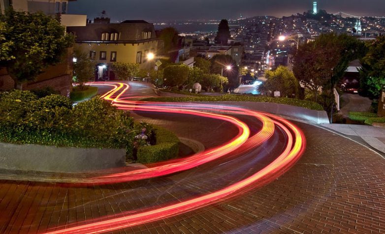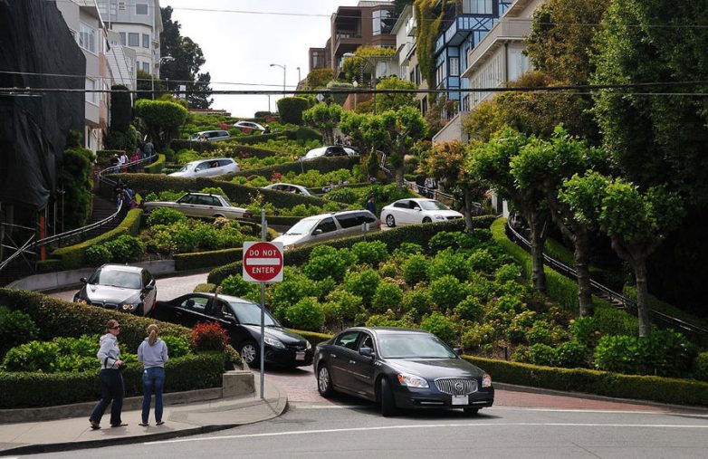 В американском городе Сан-Франциско на Русском холме находится самая кривая улица в мире. Ломбард-стрит — так называется эта знаменитая улица, которая имеет уклон 27%, а скорость на ней ограничена 8 км/ч.