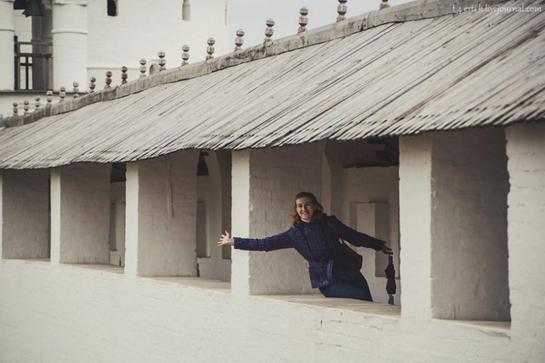 Я слышала много восторженных отзывов о Ростовском кремле и была рада убедиться, что он действительно хорош. Я бы даже сказала, что гулять по нему интереснее, чем по Кремлю в Москве.О том, что сцены фильма «Иван Васильевич меняет профессию» снимали именно здесь, я думаю, многие знают. Момент с прыжком со стены был снят в месте, где ее высота весьма скромна — на фото ниже непокрашенный участок.