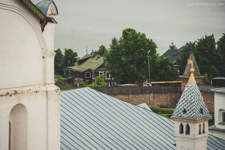 Стоит обязательно забраться на смотровую башню — вид на кремль и город открывается потрясающий. Здесь видно, что у стен кремля сохранились торговые ряды и другие старинные постройки, некоторые из них полуразрушены, а еще прямо у кремлевских стен расположились частные дома, старые деревянные и новенькие из кирпича.