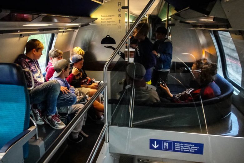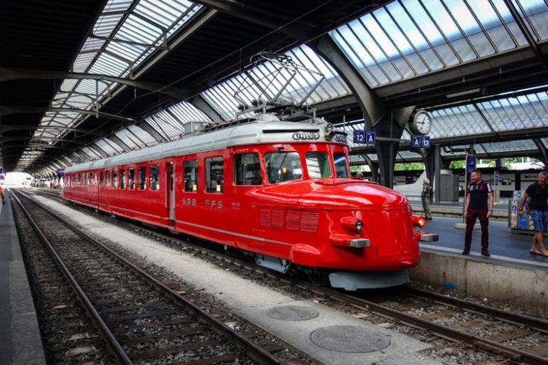 Как и у соседей-немцев, в Швейцарии большинство междугородних поездов двухэтажные. Красно-белая гамма – фирменный стиль для составов, принадлежащих SBB CFF FFS.