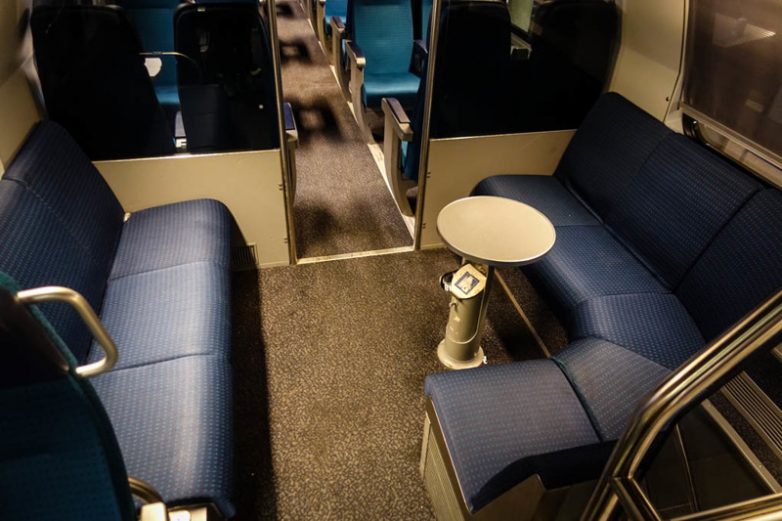 Вообще, что очень радует в этих поездах, это разнообразие конфигураций сидений. Швейцарцы понимают, что у разных пассажиров есть разные потребности. Кто-то хочет тихо работать, кто-то смотреть в окно в одиночестве, а кто-то — общаться дружной компанией. В швейцарских поездах для всех этих людей найдётся своё место. Вот, например, часть вагона, подходящая для больших тусовок (это тоже 2-й класс):