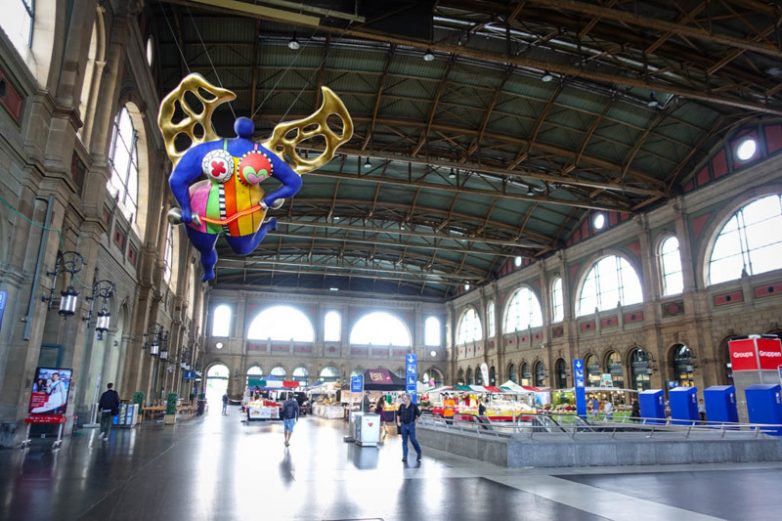 Давайте немного посмотрим на вокзалы и станции, ведь они тоже сильно влияют на общее ощущение от железнодорожной системы… Вот главный вокзал Цюриха – огромное здание с высокими сводами, под которыми вывешивают работы скульпторов. Здесь ещё несколько подземных уровней есть.