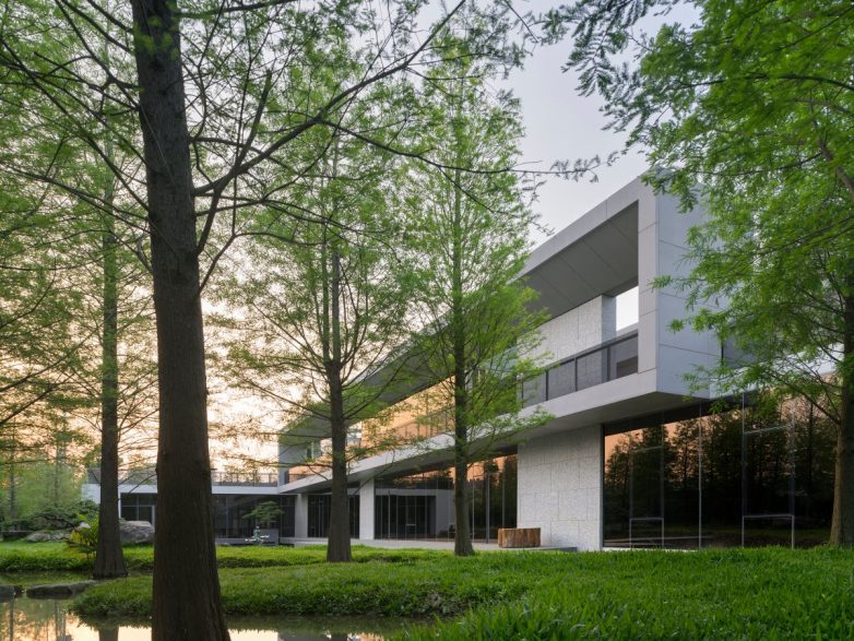 7. Штаб-квартира SY Construction, Тайчжун, Тайвань. Бетонное здание, расположенное среди деревьев.