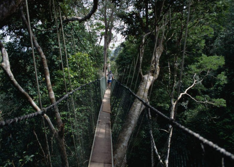 Среди тропических лесов Малайзии раскинулся национальный парк Таман Негара. Один из маршрутов парка проходит по подвесному мосту длиной 510 метров. Узкая дорожка из веревок и досок располагается на высоте более 45 метров от земли, прямо у вершин деревьев.