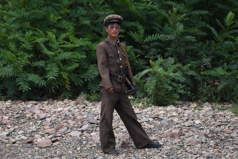 Северокорейский солдат на берегу реки Ялуцзян в городе Синыйджу. По реке Ялуцзян проходит граница между Китаем и Северной Кореей.