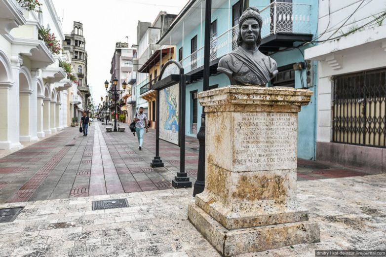 (Фото справа) Памятник Николасу де Овандо (ок. 1460 — 1511) – испанскому участнику конкисты и третьему губернатору острова Гаити (Эспаньолы) (1502-1509), члену духовно-рыцарского ордена Алькантара, который был известен применением жестоких способов подавления восстаний местных племен индейцев таино. Перевел основное городское строительство на каменные дома, что значительно снизило численность пожаров, по сравнению с другими поселениями на территории Карибского региона.