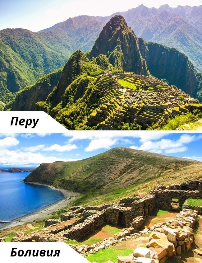 Когда смотришь на эти две картинки, так и хочется начать играть в «найди 10 отличий». Оба готических собора находятся во Франции: Нотр-Дам в столице, а Собор Амьенской Богоматери в городе Амьен на севере страны. У первого был отличный пиарщик — Виктор Гюго, написавший роман про цыганку Эсмеральду, поэтому возле него всегда толпы туристов. Второму повезло чуть меньше, но от этого он только выиграл — в любое время года можно приехать и насладиться готической архитектурой без посторонних.Мачу-Пикчу / Исла-дель-Соль