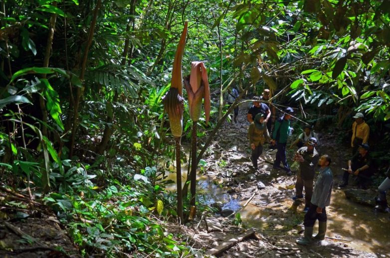 Цветок аморфофаллуса (Amorphophallus gigas) в округе Кампар в провинции Риау в Индонезии. Аморфофаллус имеет крупнейшее в мире соцветие. Цветок источает неприятный запах разлагающейся плоти, который привлекает насекомых.