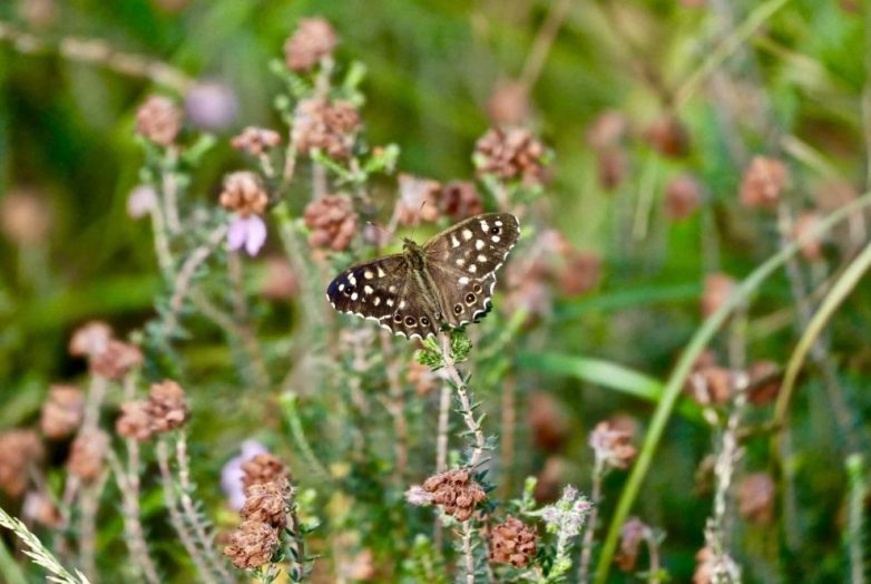 Краеглазка эгерия откладывает яйца в Арне, Дорсет, Англия.