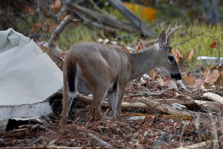 Редкий рифовый олень пробирается через завалы после урагана «Ирма» в Биг-Пайн-Ки, Флорида, США.