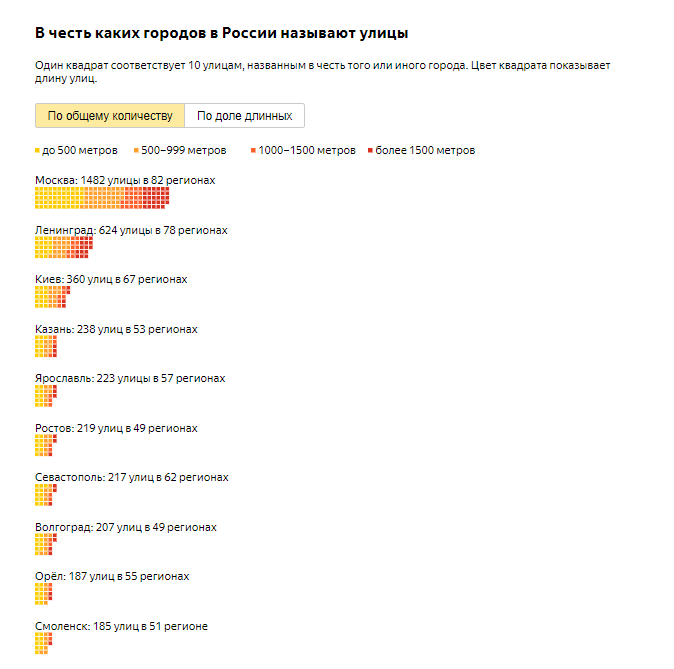 Компания «Яндекс» провела большое исследование улиц России. Используя данные сервиса «Яндекс.Карты», аналитики изучили названия, форму и протяженность 560 тысяч улиц в 43 тысячах населенных пунктов.