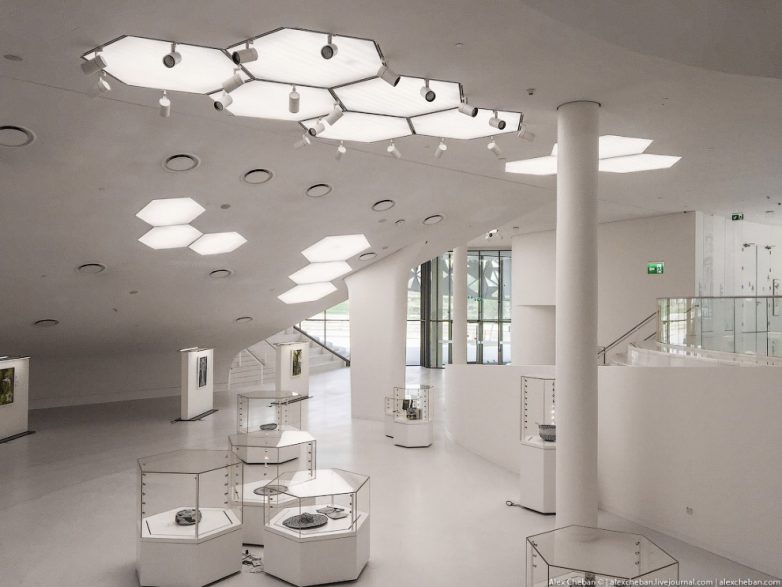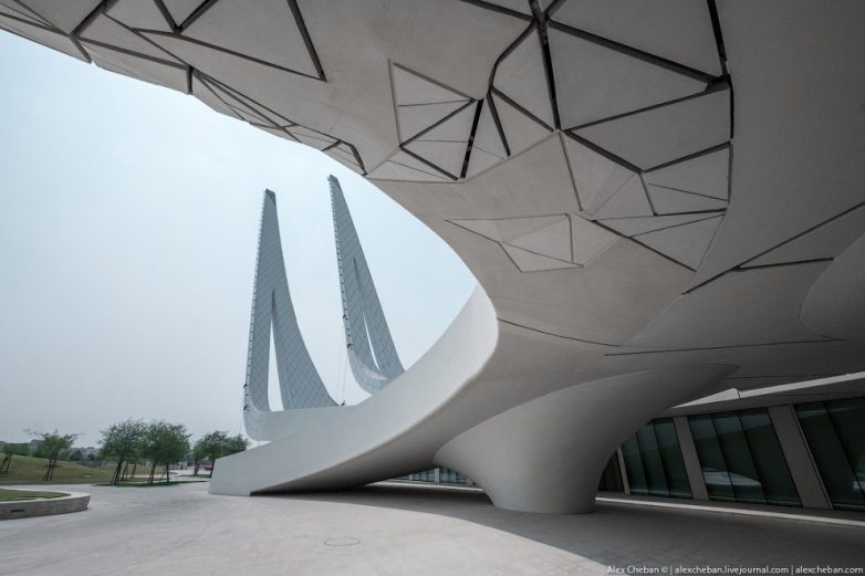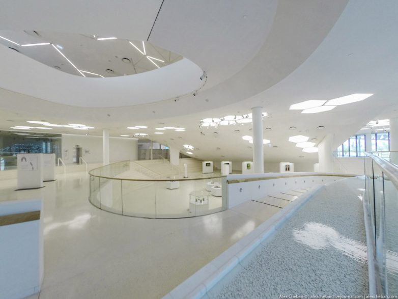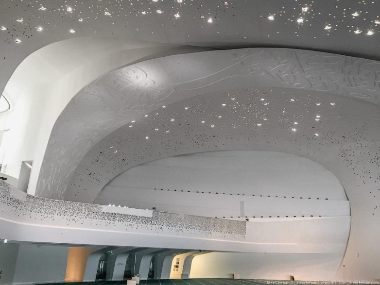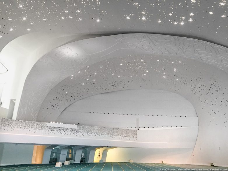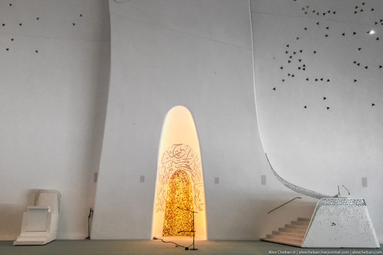 Яркий солнечный свет наполняет огромные пространства, белый цвет стен и ни одного острого угла, ручейки и водопады прерываются пешеходными мостиками… Да, это мечеть! Трудно поверить, что мечеть может иметь такую футуристическую архитектуру.