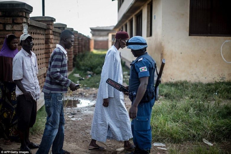 Миротворец ООН из Бурунди с металлоискателем у входа в избирательный участок в Банги, декабрь 2015 года.