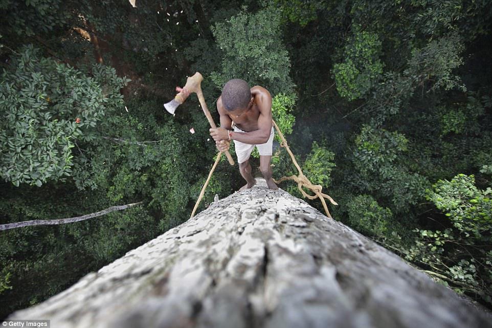Пигмей мбенга взбирается на дерево, чтобы добыть мёд. Топор нужен для того, чтобы прорубать выемки для ног.