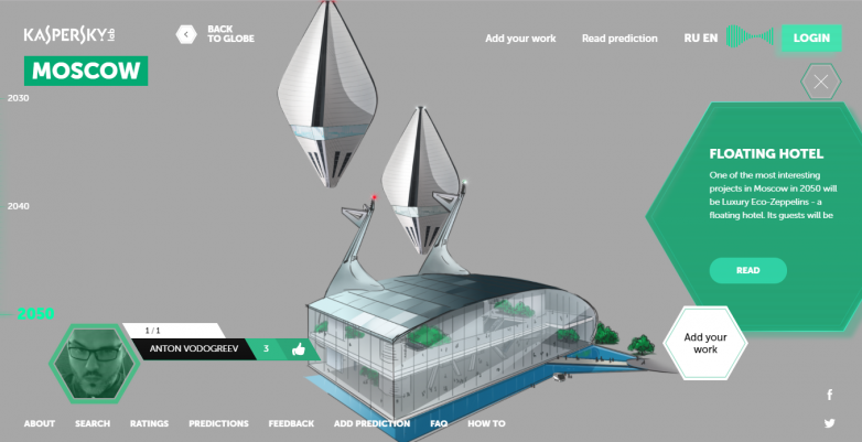 Известные футурологи и эксперты «Лаборатории Касперского» представили, как будут выглядеть 80 городов мира в 2030, 2040 и 2050 годах. Несколько прогнозов посвящены будущему России, в том числе Томска, порта Диксон, космодрома «Восточный» и Москвы.