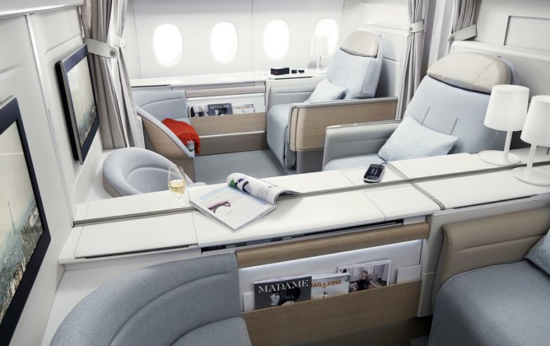 La Première, именно так называется первый класс на борту Air France, это 4 или 9 сьютов (по одному месту у окон и два в центре), которые напоминают скорее удобное кресло где-нибудь в гостиной. С той лишь разницей, что это кресло раскладывается в двухметровую кровать. Проблема приватности была решена по-французски просто: две огромные шторы скрывают вас от внешнего мира. Естественно, на борту гостей ждет еда от лучших французских поваров, пижама, дорожный набор.