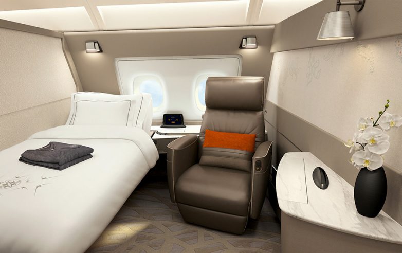 Singapore Airlines представила обновленные кабины с раздвижными дверьми в начале ноября. Ключевая особенность: разделение кровати и кресла. Теперь в каждую каюту (всего их шесть) помещают разложенную кровать (длина 193 см) и вращающееся кожаное кресло шириной 53 см. Две кабины сьют можно объединить, превратив две кровати в одну двуспальную. В каждой каюте свой гардероб, телевизор диагональю 81 см, электрические розетки и USB. Singapore Airlines инвестировала $850 млн в новый продукт.