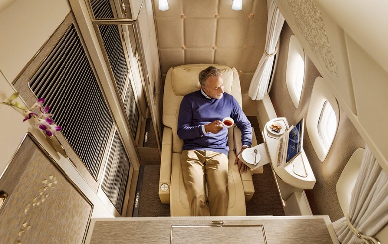 Авиакомпания Emirates презентовала обновленный салон первого класса на Dubai Airshow 2017 12 ноября. Дизайн шести сюитов создан в сотрудничестве с Mercedes-Benz. Все каюты оснащены раздвижной дверью, которая полностью изолирует пассажира от внешнего мира. Новое кресло может раскладываться почти в двухметровую кровать и принимать специальное положение zero-gravity, как у космонавтов. Пассажиры могут вызывать бортпроводников по видео. В сюите 81-сантиметровый телевизор, а также дисплей для управления креслом, наушники Bowers& Wilkins Active Noise Cancelling E1, динамическая подсветка, климат-контроль плюс уникальные виртуальные иллюминаторы в средней кабине. Стоит ли упоминать душ и бар на борту Airbus A380?