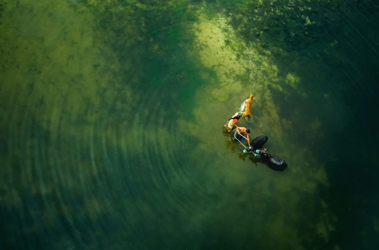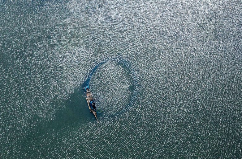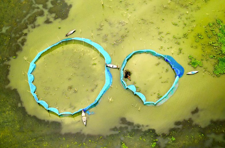 Рыбаки собирают свой улов в сети. Фотография была сделана над рекой Калиганга в полете из столицы Бангладеш, Дакки, в город Маникгандж