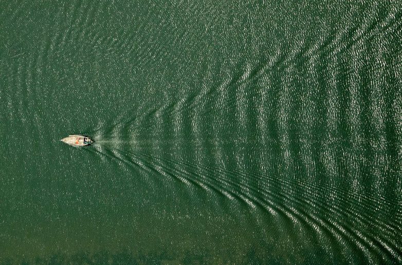 Лодка, движимая ветром, оставляет причудливый след на поверхности озера