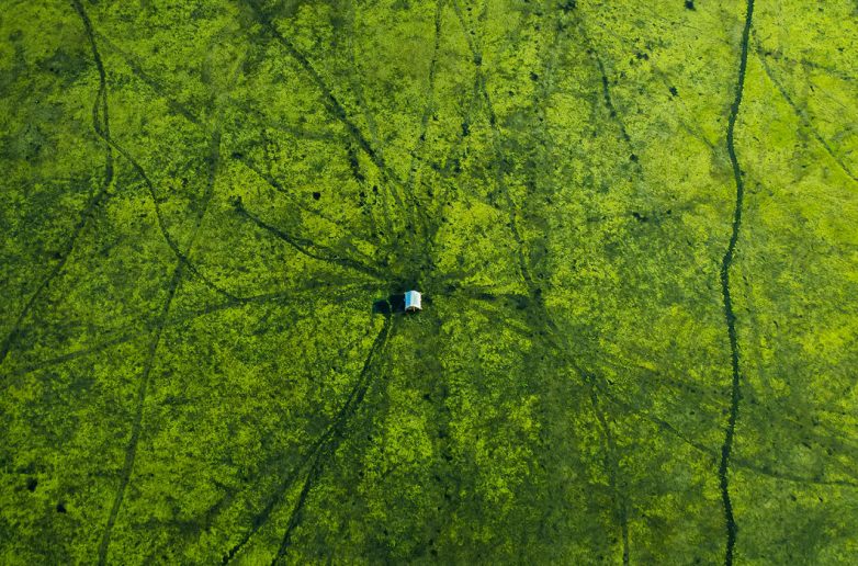 Эта небольшая хижина расположена в самом сердце озера в Магуре, полном водорослей. Каждый день рыбаки приезжают на лодках, проводят день на рыбалке в хижине, а затем уезжают. Следы лодок остаются на воде, делая хижину похожей на центр огромной паутины