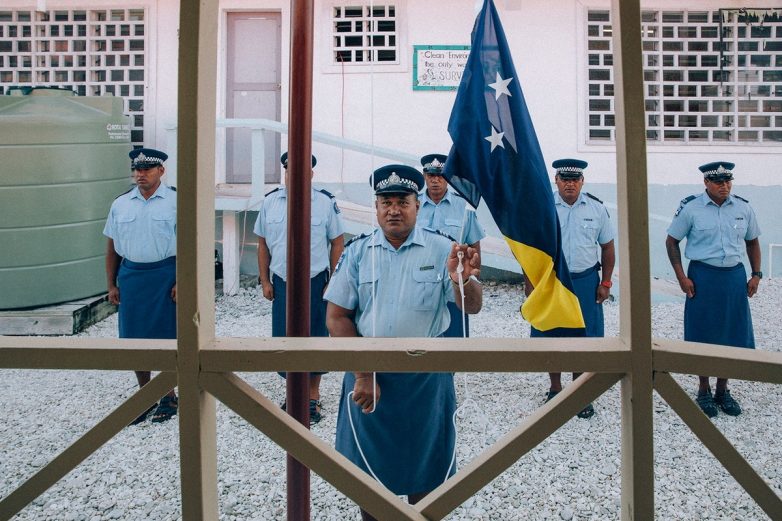 Глава полиции Факаофо поднимает флаг Токелау перед началом заседания парламента. Семеро полицейских ежедневно патрулируют остров, на котором живут 355 человек. Правоохранители хотят удостовериться в том, что граждане соблюдают комендантский час: он позволяет сохранять тишину по вечерам из религиозных соображений. Согласно правилам, все должны переставать работать после 18:00, а по воскресеньям работать запрещено. С 18:00 до 18:50 люди могут шуметь, проводить время за играми и отдыхать после работы. А с 18:50 до 19:00 жители должны быть дома и молиться. С 19:00 до 21:00 они плавают или занимаются другими видами спорта, выполняют работу по дому. С 21:00 детям нужно идти спать. После 23:00 не рекомендуется выходить на улицу и шуметь.