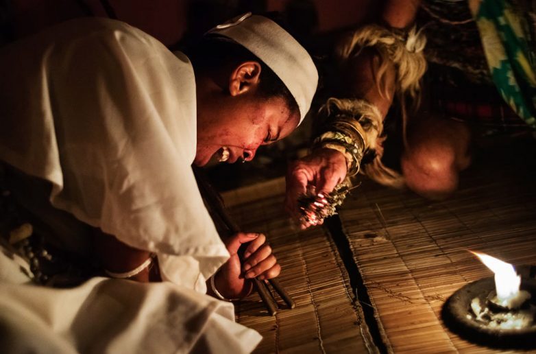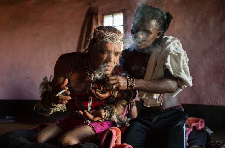 Помогая сангома Камагвини в проведении обряда, Крис дышит дымом сакрального африканского растения mphepho. Оно используется сангома для очищения духа, связи с предками и духовной защиты.