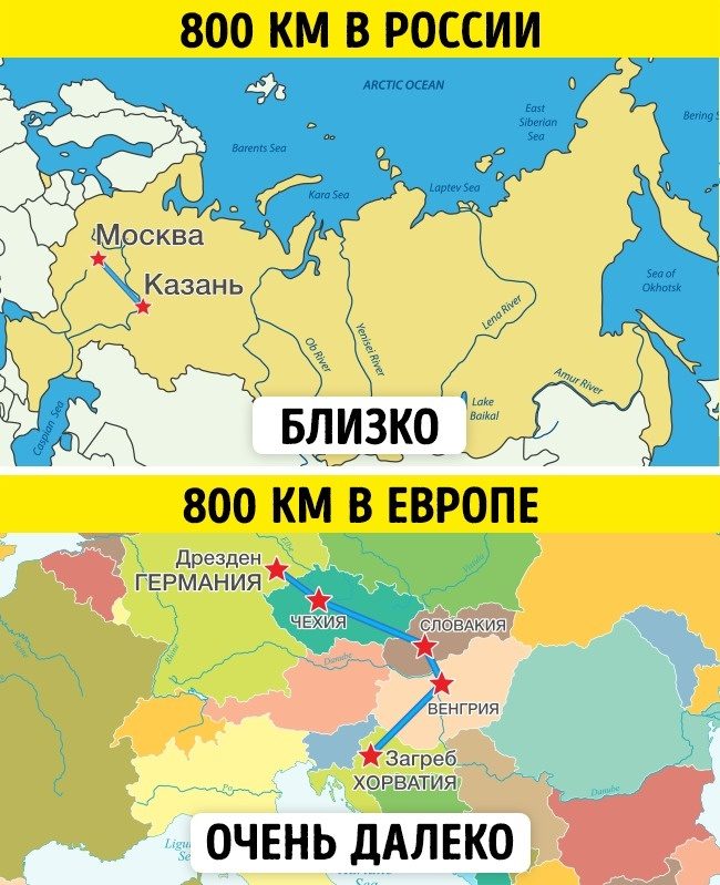Если сказать европейцу, что твой город находится недалеко от Москвы, всего в 800 км, он посмеется и скажет, что для него это очень далеко, все равно что 3–4 страны проехать.Также многих удивляет, что в совсем не густонаселенной России много (целых 15) городов-миллионников — больше только в Китае, Индии и Бразилии. Почему? Видимо, любят русские держаться друг к другу поближе. Да и чем больше город — тем проще с работой.