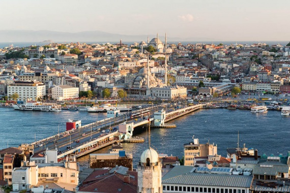 Вид с башни на Галатский мост и исторический центр Стамбула. Галатский мост – двухэтажный. Верхняя часть предназначена для транспорта и пешеходов, нижняя занята многочисленными ресторанчиками.