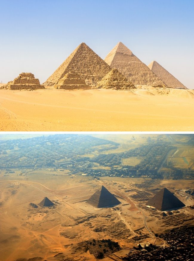 Представляя себе египетские пирамиды по книгам и фильмам, мы уверяемся, что они стоят в безлюдной пустыне, овеваемые суровыми ветрами. А на самом деле бедные районы Каира подходят к ним почти вплотную, так что зрелище открывается не слишком впечатляющее.
