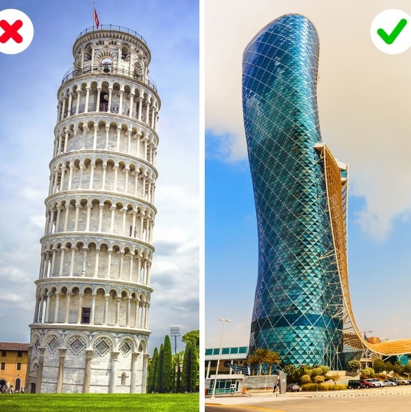 Главная «падающая» достопримечательность, с которой так любят фотографироваться туристы, на самом деле имеет довольно небольшой угол наклона — всего 3,54 градуса.А вот небоскреб Capital Gate, который еще часто называют Падающей башней Абу-Даби, попал в «Книгу рекордов Гиннесса» как здание с самым большим наклоном в мире — он отклоняется к западу на 18 градусов.
