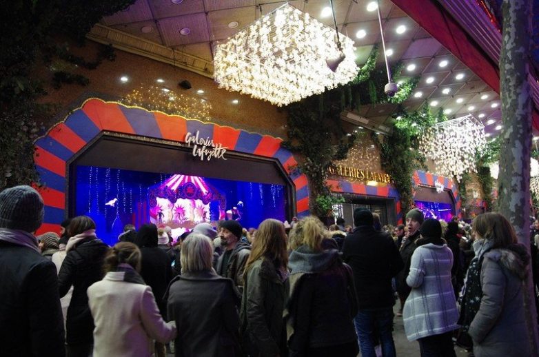 В последние лет 50 в витринах двух «Больших магазинов» устраивают спектакль из движущихся марионеток. У Printemps в последнее время получается лучше, чем у Galeries Lafayette. 11 витрин объединены темой «Удивительное путешествие подаркoв» и посвящены вояжам разными транспортными средствами в разном окружении: парфюм, сумки, сладости.
