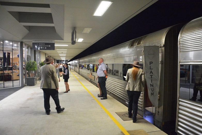 Платформа в Брокен Хиллс, как и в Сиднее, не может вместить целый 28-вагонный состав, поэтому высадку пассажиров сделали в два этапа: сначала вышли пассажиры из первой половины поезда, потом состав подвинулся вперед, и на платформу вышли остальные пассажиры. Теперь, при посадке, наш вагон оказался за краем платформы, и мы проходим в него через «платиновый» вагон-ресторан. Интересно, что по оформлению он оказался проще нашего «золотого», но, правда, столы в нем стоят более свободно.