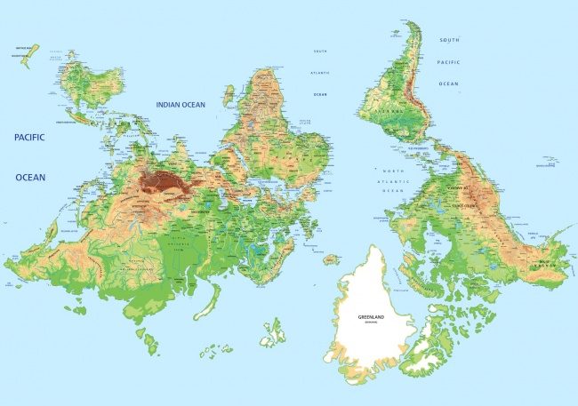 Европейская карта мира не слишком отличается от той, к которой мы привыкли: она центрируется по Гринвичу, а следовательно, немного сдвигается вправо. Положения дел это особо не меняет, разве что слегка вытесняет Магадан, Чукотку и чутка Камчатки на Западное полушарие.