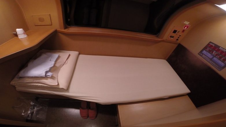 Местная плацкарта представляет собой двухуровневые сегменты, отгороженные друг от друга небольшими стенками у окна. Японцы привыкли спать на полу. Занавесками можно отделиться только от прохода, но не от соседних сегментов. Хотя, если спать головой к окну, соседей не увидишь.